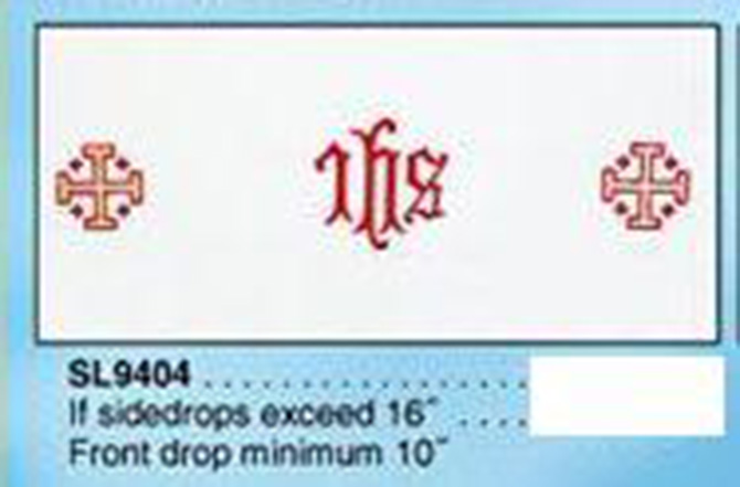 Fitted altar cloth made of 50% polyester and 50% rayon. Front drop minimum 10", maximum altar width 48".