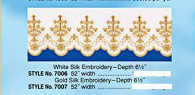 Altar linen made of 100% pure linen with gold Cross silk embroidery design-depth 6-1/2", 52" width . Additional charge for hemming. ( When ordering yard goods allow 1" per yard for shrinkage. )