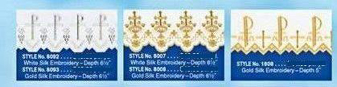 Altar linen made of 100% polyester with gold Chi-Rho silk embroidery design-depth 5", 58" width. Additional charge for hemming. ( Maximum 15 yards only. If order exceeds 15 yards, give breakdown on cuts needed. )