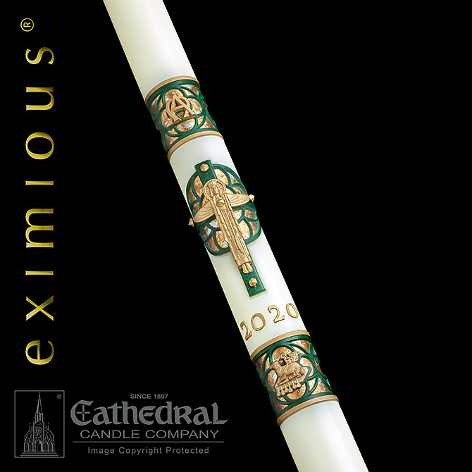 This exquisite design celebrates the Kingship of Christ as King of all humankind, King eternal, King of all kings, King of the ages, and Lord of all creation. Featuring the triumphant Christ as the centerpiece of a Gothic rose window, artisans carefully apply all natural, fine metal leafing to recreate the brilliant, illuminated look of traditional stained glass. The Christ the King design is further enunciated by the presence of both the intertwined Alpha Omega and the Victorious Agnus Dei framed within classic quatrefoil designs. Made To Order; Hand Made, 51% Beeswax; Intricate Inlays & Details; Made in USA. Includes set of wax nails with incense on tips and stickers for the year.