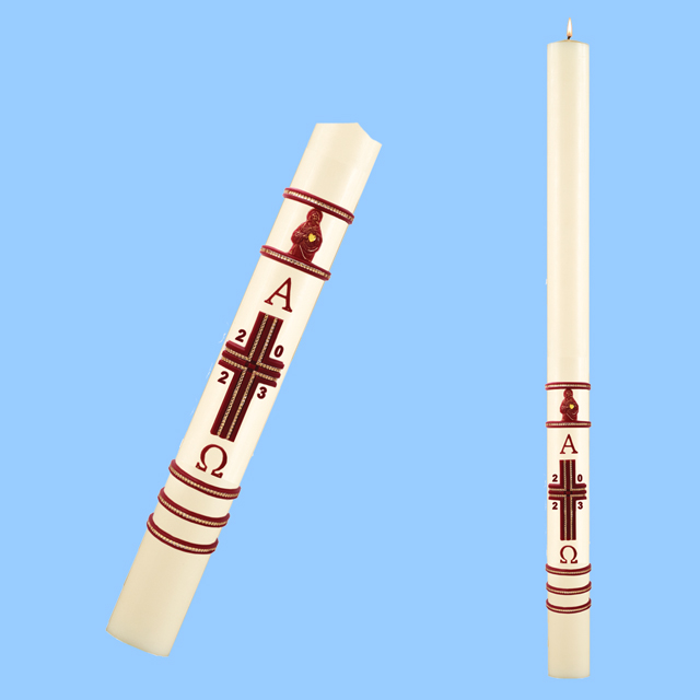 Each candle is extensively decorated featuring a wax center panel with the Alpha and Omega symbols on top and bottom and an image of a Block Red and Gold Cross in the center. The top bank includes and image of the Sacred Heart of Jesus. Made of 51% beeswax to ensure excellent burning qualities. Each pattern is fashioned entirely by hand. Matching side altar candles are available, please see related items. Paschal nail set included.