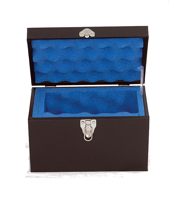 Hardcover storage case with lockable clasp and padded interior. Maximum 9" height, 5-3/4" wide, 5-1/2" deep.