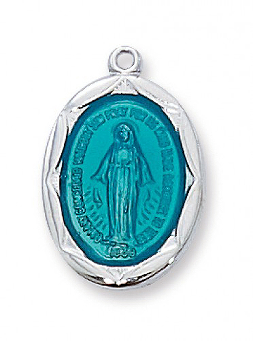 Blue enameled sterling silver medal. Hand-engraved and coated with a protective lacquer. On 18" stainless steel chain and gift box.