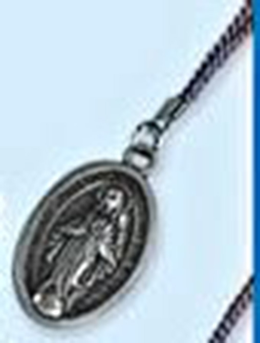 Large oxidized Miraculous medal; 2"long x 1"wide on a 30" blue cord.