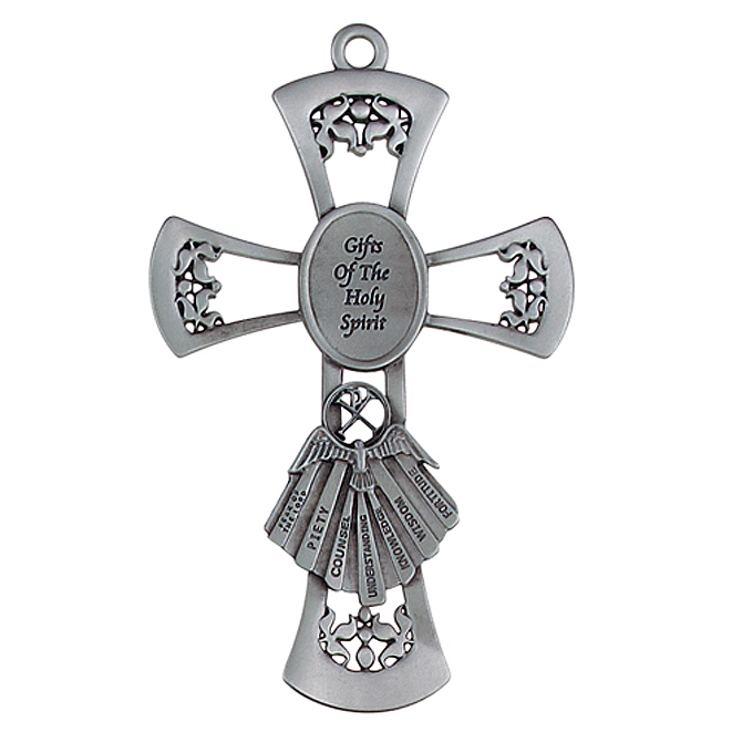6" high pewter cross. Gifts of the holy spirit.