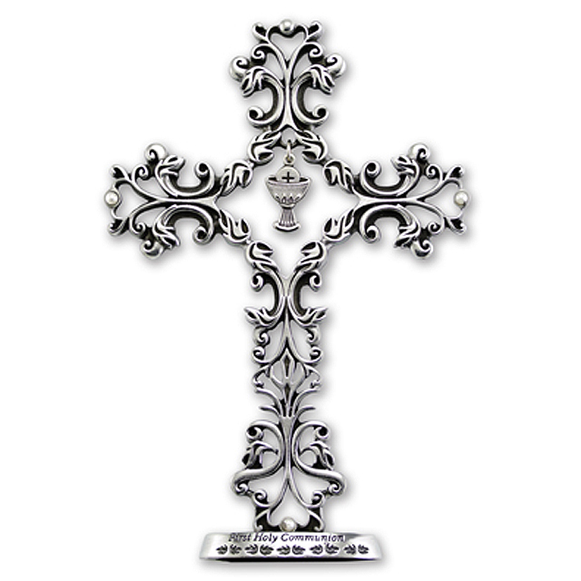 Standing pewter cross, 5" high with "First Holy Communion" wording in the base and a chalice in the center.