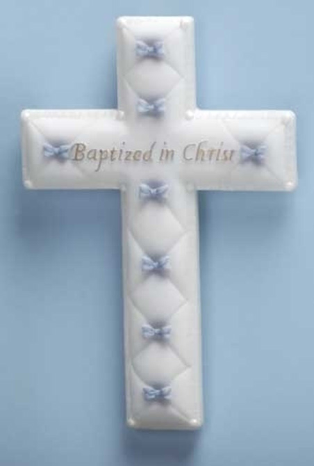 Resin-stone mix wall cross with blue accents. Verse reads: "Baptized in Christ" Boxed. 6-1/2