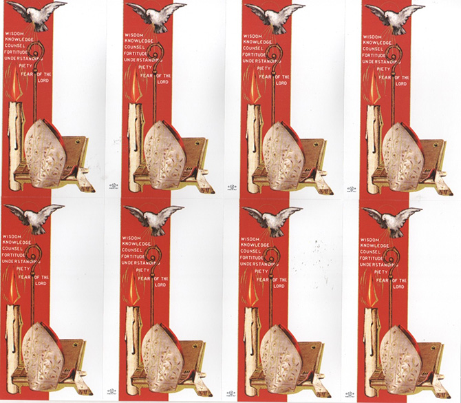Full color paper holy cards on a sheet with blank back. Micro-perforated to easily detach. Ready to imprint through a printer. 8 cards per sheet. 8-1/2" x 10