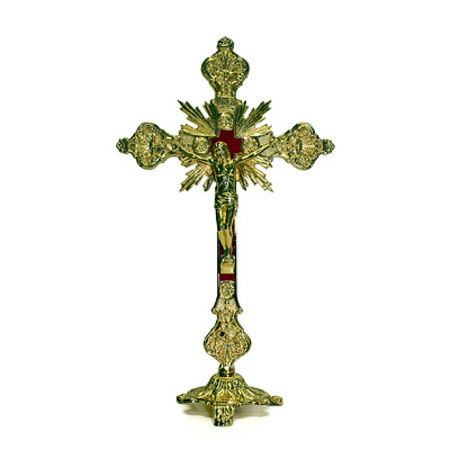 Standing metal crucifix, gold finish 9 inches tall. Ships in two pieces, easy assembly.