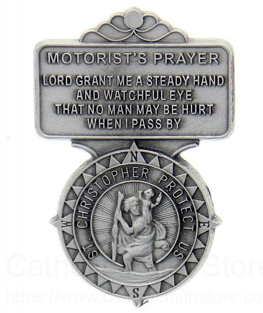 Heavyweight oxidized pewter visor clip featuring a round St. Christopher and reads "ST. CHRISTOPHER PROTECT US" with a motorist's prayer on top and reads "MOTORIST'S PRAYER LORD GRAND ME A STEADY HAND AND WATCHFUL EYE, THAT NO MAN MAY BE HURT WHEN I PASS BY". Back has a polished slide to hold securely on your visor. Carded and polybagged.
