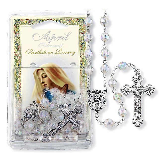 Quality aurora borealis faceted colorful and inexpensive Catholic rosaries. Our beautiful 8 mm Aurora Borealis Faceted Acrylic 'April-Crystal' Birthstone Bead Rosary has a detailed silver oxidized 'Mary' center and stunning crucifix. Fine quality and inexpensive, this Catholic rosary comes packaged with our Italian 'Fratelli Bonella' artwork, ready to hang.