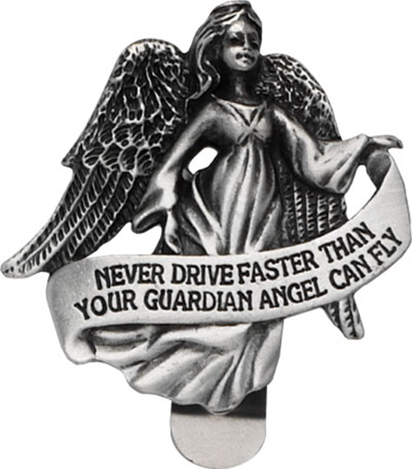 Automobile metal Guaredian Angel visor clip holding banner that reads "Never Drive Faster Than Your Guardian Angel Can Fly".