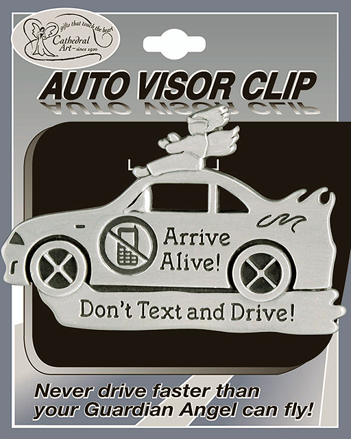 Metal visor clip in the shape of an automobile with the admonishment "Arrive Alive! Don't Text and Drive!"