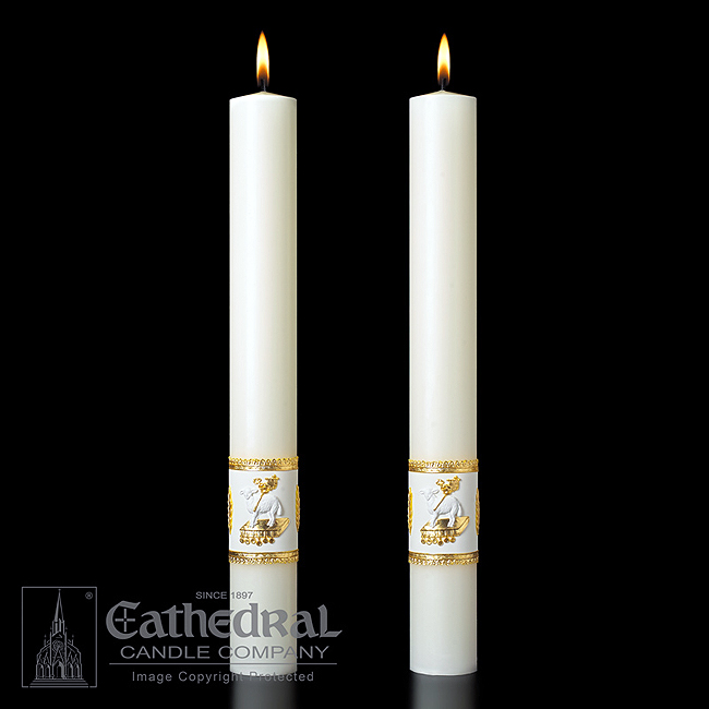 An attractive pair of altar candles designed to complement the design of the Ornamented Paschal Candle.