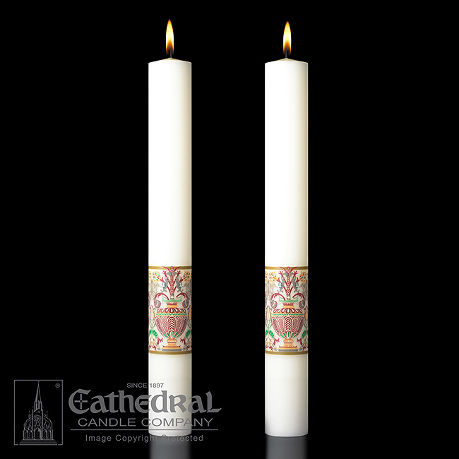 An attractive pair of altar candles designed to complement the design of the Investiture Paschal Candle.