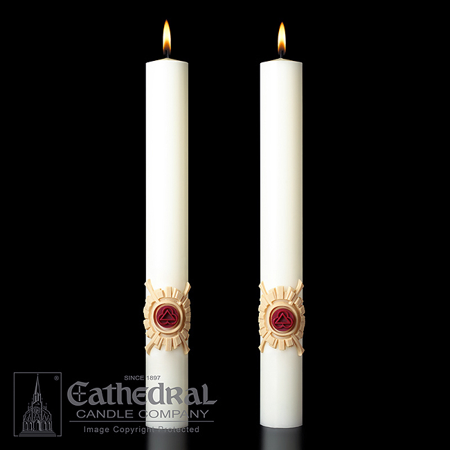 An attractive pair of altar candles designed to complement the design of the Holy Trinity Paschal Candle.