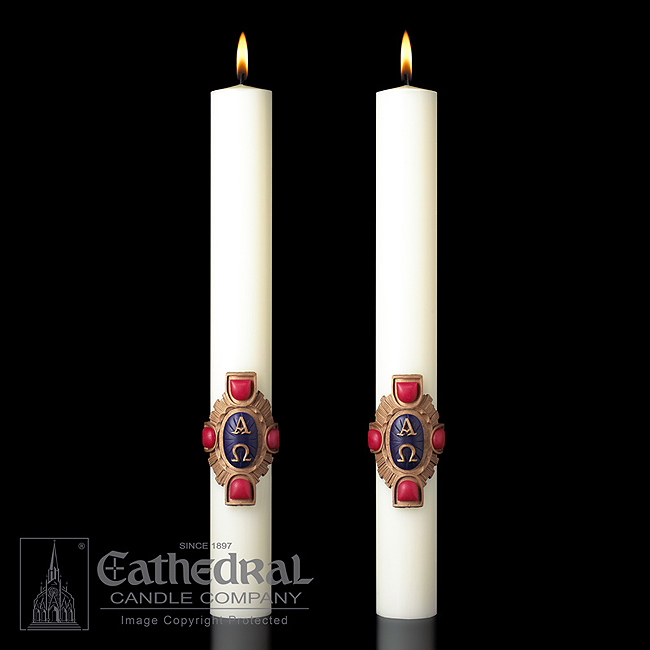 An attractive pair of altar candles designed to complement the design of the Christ Victorious Paschal Candle.